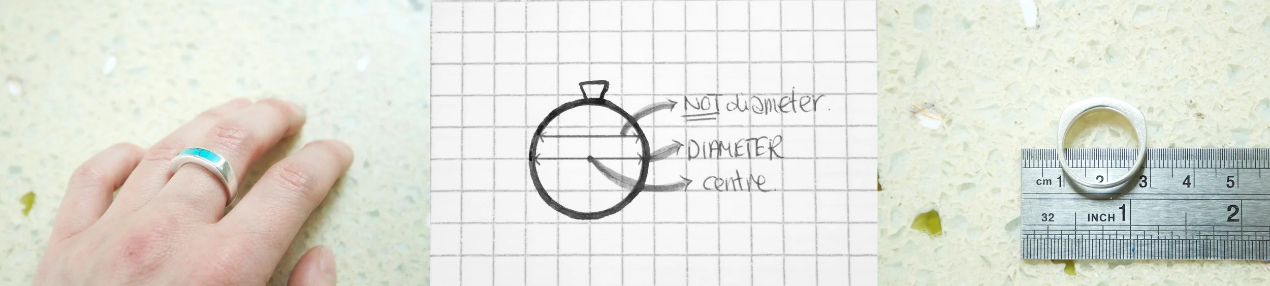 - Imagine a line going from one side of the ring to the other passing through the centre of the circle. (See image above)This is your Inside Diameter; use the chart bellow to convert this into your ring size.