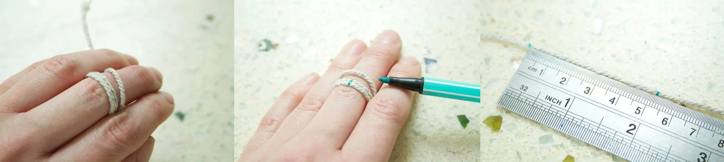 Wrap a piece of string a couple of times around the widest part of the finger you wish to wear the ring on, for most people this is usually the bottom knuckle. (Remember, the ring has to get over your knuckle)
